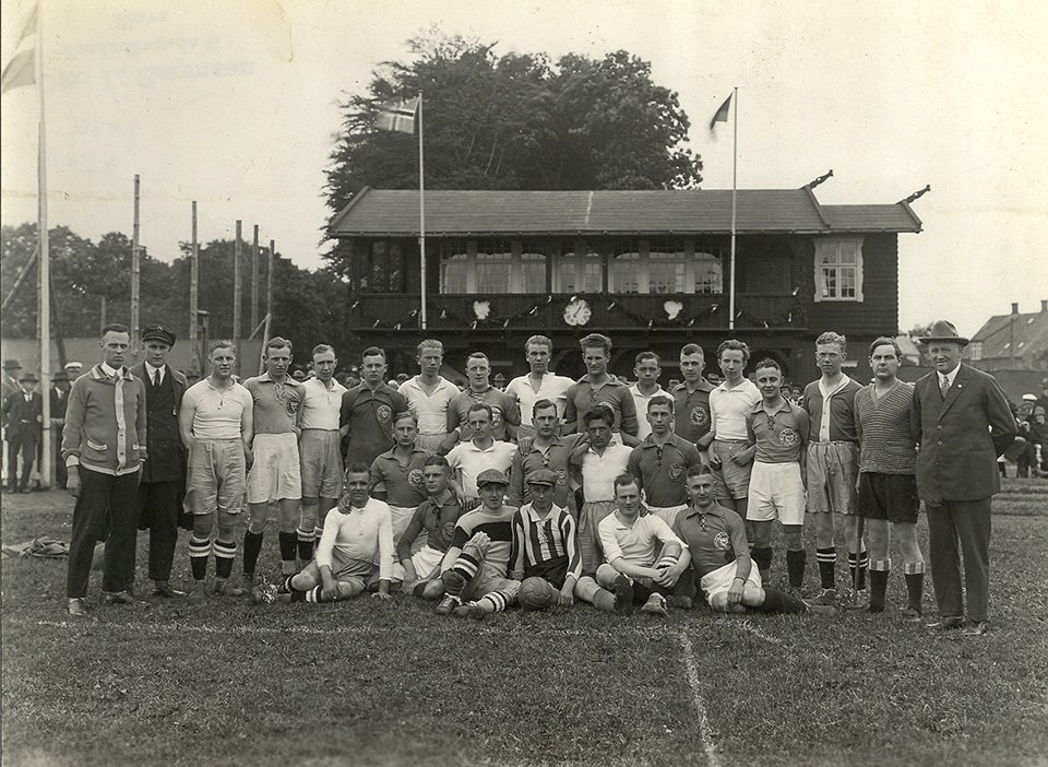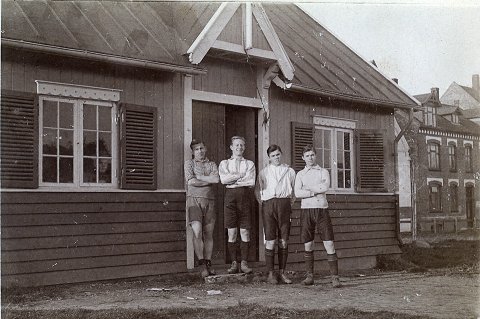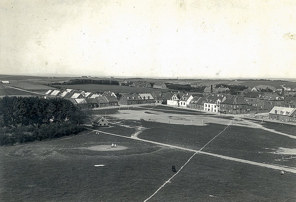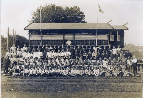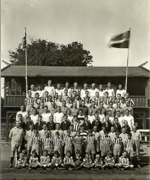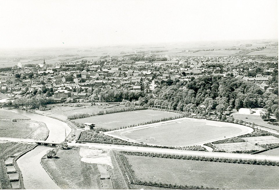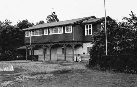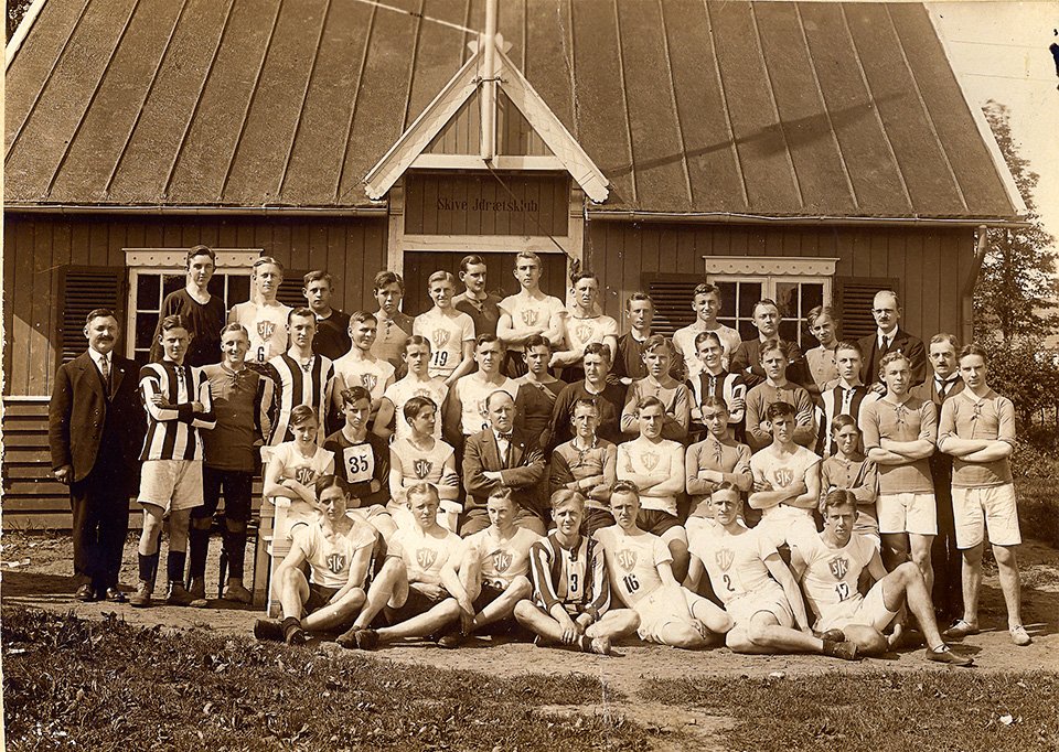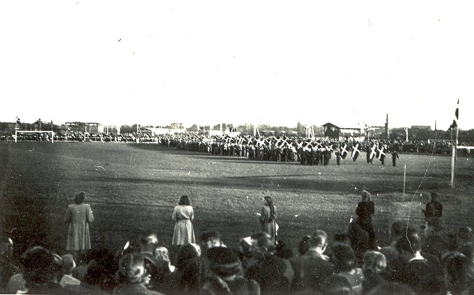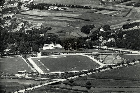 I 1944 blev det nuværende stadion indviet. Skive kommune havde egentlig lovet Skive Idrætsklub et nyt klubhus, men det kunne man ikke få materialebevilling til, så i stedet overtog kommunen klubhuset og flyttede det til det nye stadion, Foto ca. 1946.